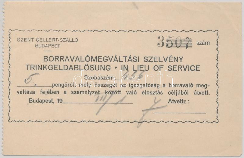 ~1930-1940. "Szent Gellért-Szálló Budapest - Borravalómegváltási szelvény" 5P-ről T:II-