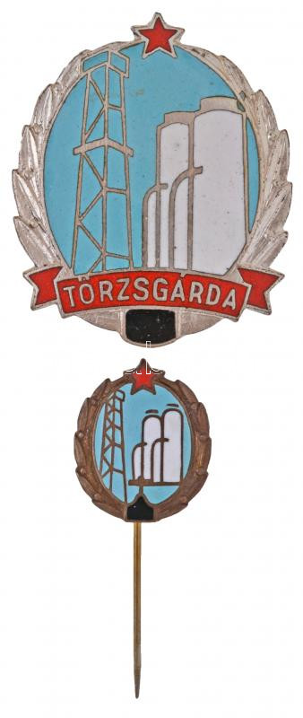 ~1960. Olajipari "Törzsgárda" sorszámozott, zománcozott, ezüstözött fém jelvény + Br miniatűr kitűző T:2