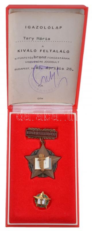 ~1985. "Kiváló Feltaláló Bronz fokozata" zománcozott kitüntetés miniatűrrel,viselésre jogosító igazolólappal, tokban T:1-,2
