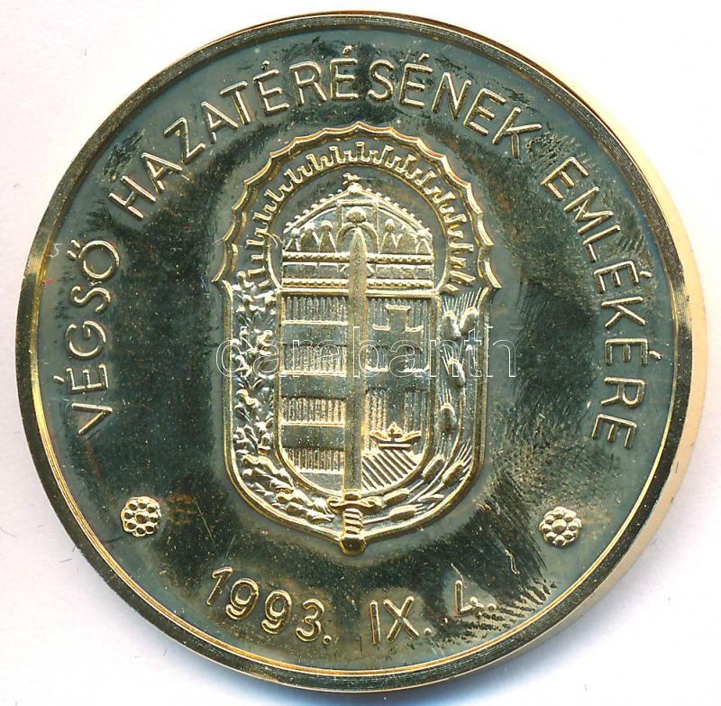 1993. "Vitéz Nagybányai Horthy Miklós Magyarország Kormányzója / Végső Hazatérésének Emlékére-Vitézi Jelvény" aranyozott tombak emlékérem tokban, sérült tanúsítvánnyal (40mm) T:PP ujjlenyomat