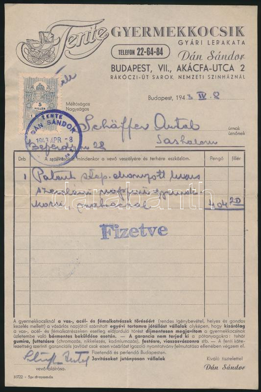 1943 Bp. VII. Akácfa utca, Tente Gyermekkocsik Gyári Lerakatának fejléces számlája 5f okmánybélyeggel