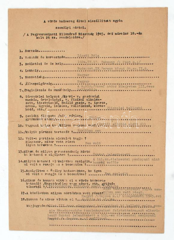 1945 A vörös hadsereg által egyén személyi adatai, kitöltött kérdőív