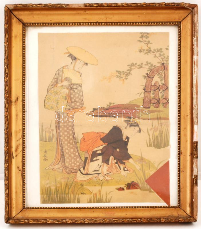 Díszes, egyik oldalán sérült, üvegezett fa képkeret, benne japán életképes nyomattal, belső méret: 28,5×22,5 cm, külső méret: 34,5×28 cm
