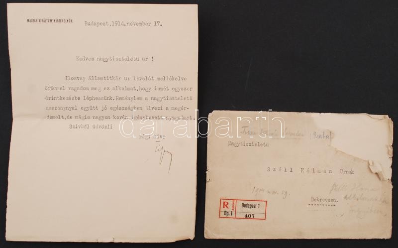 Description: 1914 gróf Tisza István miniszterelnök géppel írt, saját kezűleg aláírt levele (nov. 17.) Szél Kálmán nyugalmazott szalontai esperesnek Debrecenbe. Borítékban, Ilosvay Lajos (1851-1936), a vallás- és közoktatásúgyi minisztérium államtitkárának (1914-1917) hivatkozott levele nélkül.