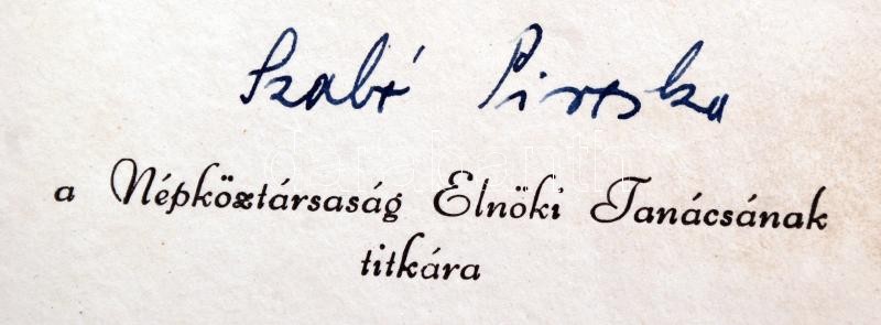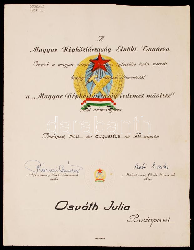 1950 Diploma of the People's Republic of Hungary about the granting of the title "Worthy Artist of the People's Republic of Hungary" to Júlia Osváth (1908-1994) operatic singer with the autographs of Sándor Rónai (1892-1965) the president of the Presidential Council and Piroska Szabó, the secretary of the Presidential Council