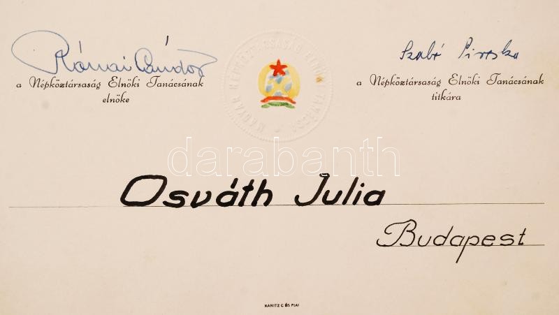 1950 A Magyar Népköztársaság Elnöki Tanácsa oklevele a "Magyar Népköztársaság érdemes művésze" cÃm adományozásáról Osváth Júlia (1908-1994) opera-énekesnÅ‘ részére, Rónai Sándor (1892-1965), az Elnöki Tanács elnöke (1950-1952) és Szabó Piroska, az Elnöki Tanács titkára (1950-1953) aláÃrásaival. A cÃerek kézzel kiszÃnezve utólag. Körbevágott. /