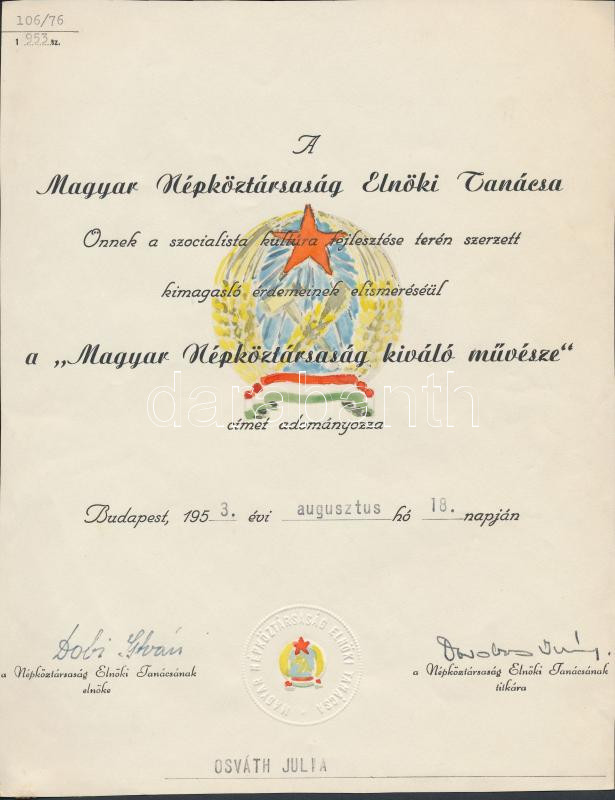 1953 A Magyar Népköztársaság Elnöki Tanácsa oklevele a "Magyar Népköztársaság kiváló művésze" cím adományozásáról Osváth Júlia (1908-1994) opera-énekesnő részére, Dobi István (1898-1968), Magyarország korábbi miniszterelnöke (1948-1952), ekkoriban az Elnöki Tanács elnöke (1952-1967) és Darabos Iván, az Elnöki Tanács titkára (1953-1956) aláírásaival. A címerek utólag kézzel kifestve. Körbevágva. /