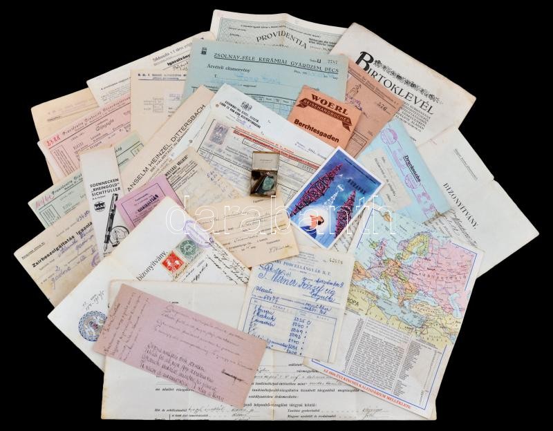 Vegyes papírrégiség tétel, benne érdekesebb dokumentumok, munkaszolgálatos katona dokumentumai, biztosítási okmányok