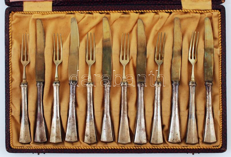 Ezüst (Ag.) nyelű desszertes készlet, jelzett, eredeti dobozában, brut...
