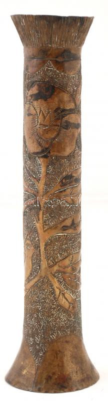 Ágyúhüvelyből készített madaras váza, poncolt, réz, m:24 cm