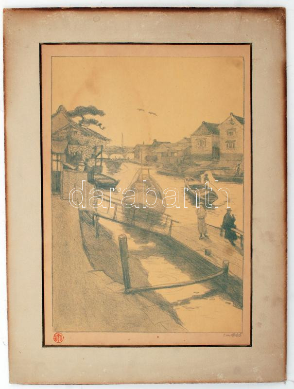 Olvashatatlan jelzéssel: Távol keleti utcakép. Litográfia, papír, pecs...