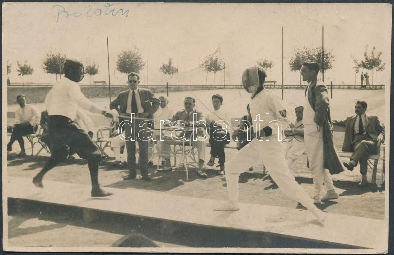 1933 Vívók a Balatonon, egyikőjük az FTC 1901-1947 között működött vívó szakosztályából, fotó, hátulján feliratozva, 9×13,5 cm