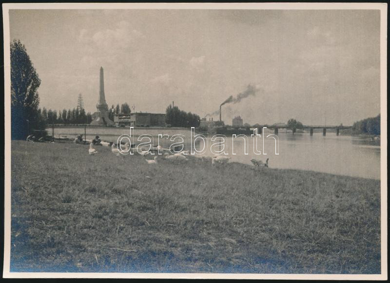 cca 1940 Győr, vízparti tájkép híddal, emlékművel, 12x17 cm