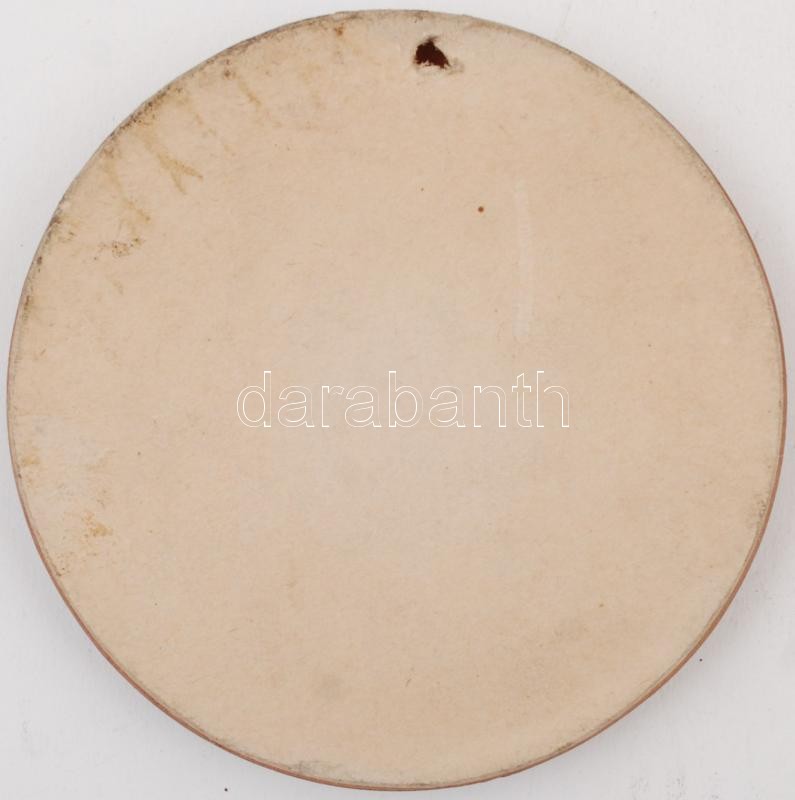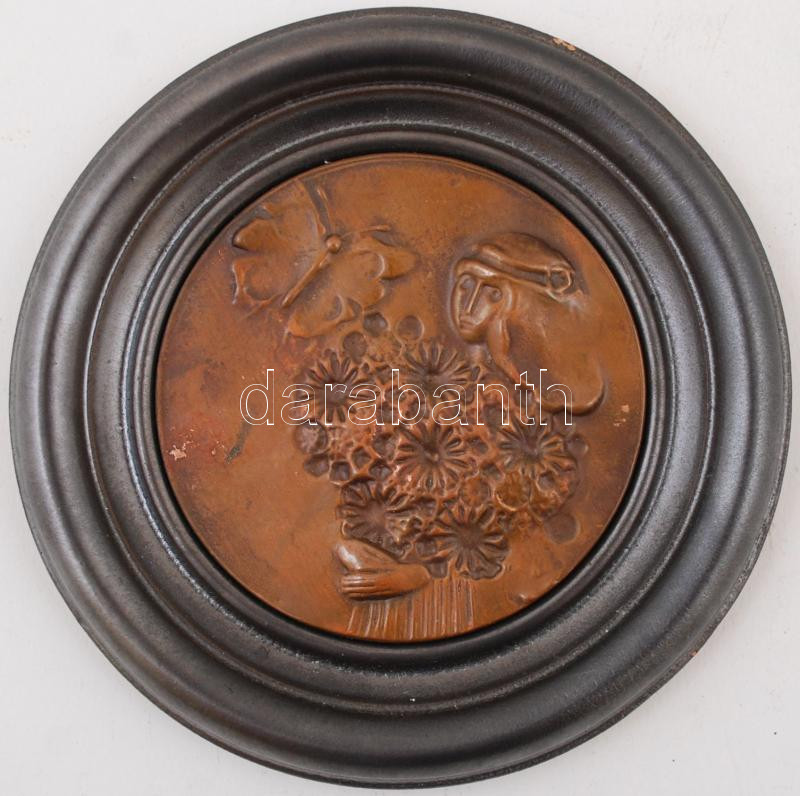 Ligeti Erika (1934-2004): Virágszedő lány, réz plakett kerámia keretben, jelzés nélkül, d: 13,5 cm