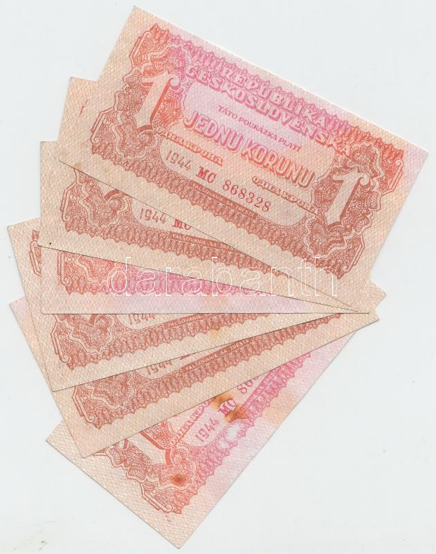 Czechoslovakia 1944. 1 Korun (6x) sequential serials C:mixed (more unfolded, but stained)
