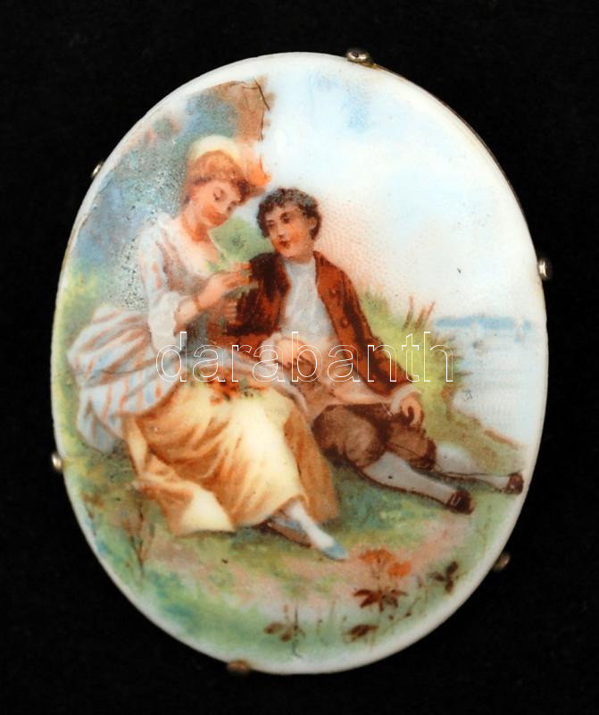 Életképes porcelán kitűző/medál fém foglalatban, matricás, jelzés nélkül, apró kopásnyomokkal, díszes tokban, 4,5×3,5 cm