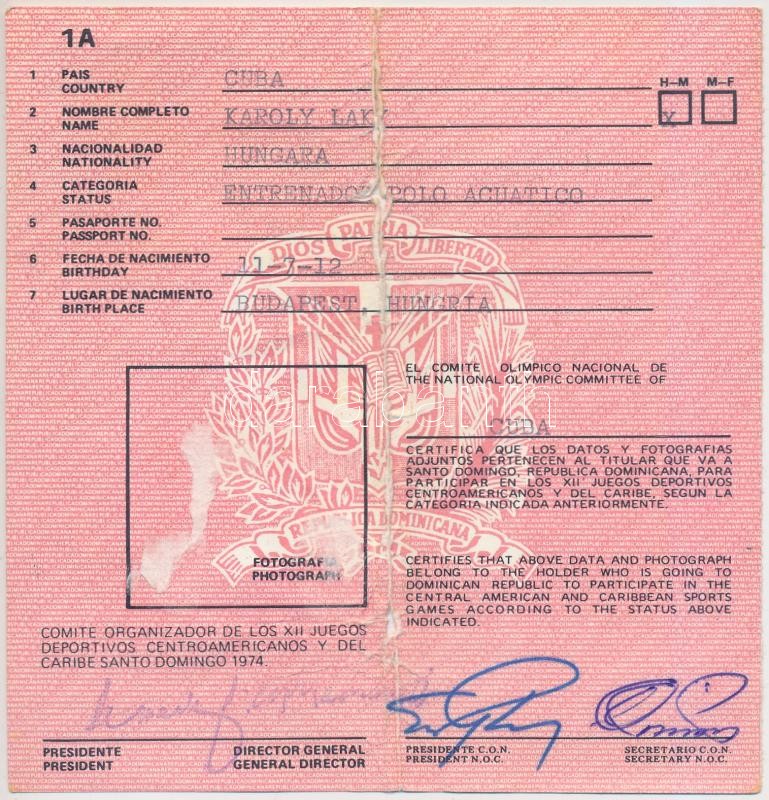 1974 Laky Károly mesteredző részére kiállított személyi igazolvány