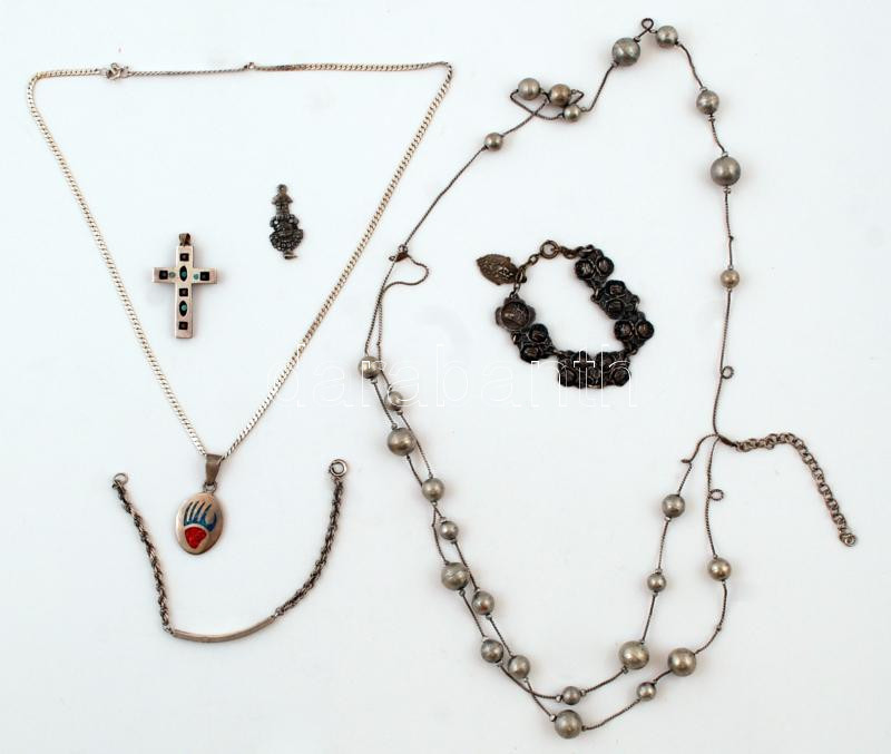 Bizsu tétel, benne: 2 db nyaklánc (egyik ezüstözött), 3 medál, 2 karkötő, összesen: 7 db