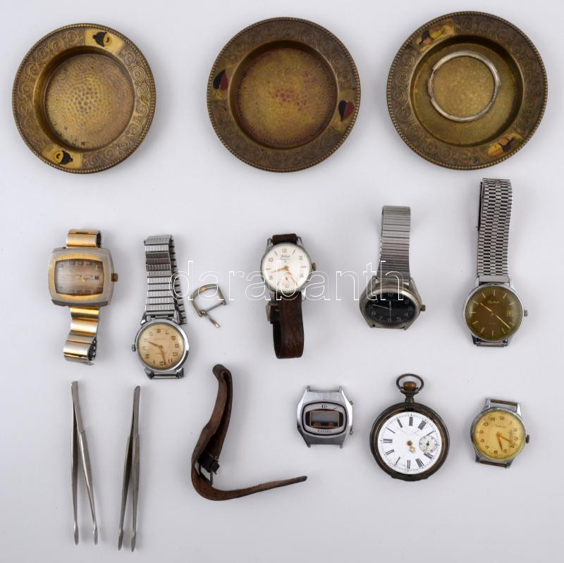 Vegyes bolha tétel, különféle zseb és quartz órák (benne ezüst is), csipeszek, tálkák