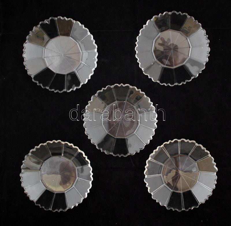 5 db üveg tányér, jelzés nélkül, apró csorbákkal, d: 14,5 cm