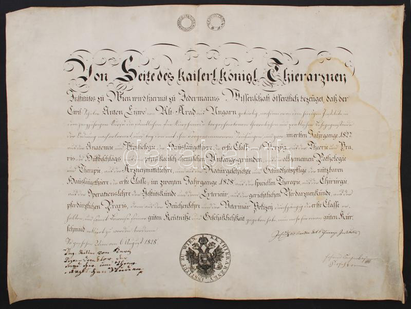 1828 A bécsi császári-királyi Állatgyógyászati Intézet (k. k. Thierarz... https://www.darabanth.com/en/235-Online-auction/235.0/Other-collectibles/Historical-documents-manuscripts~400034/1828-A-becsi-csaszari-kiralyi-Allatgyogyaszati-Intezet-k-k-Thierarzney-Institut-diploma~II1079902