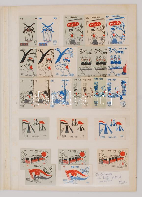 26 db különféle úttörő motívumos gyufacímke, berakóba rendezve