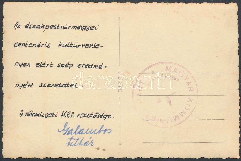1948 A rákosligeti amatőr színjátszók előadása, fotólap, hátulján az MKP rákosligeti szervezete vezetőségének üdvözlő soraival, Galambos Marcell titkár aláírásával, 9×13,5 cm