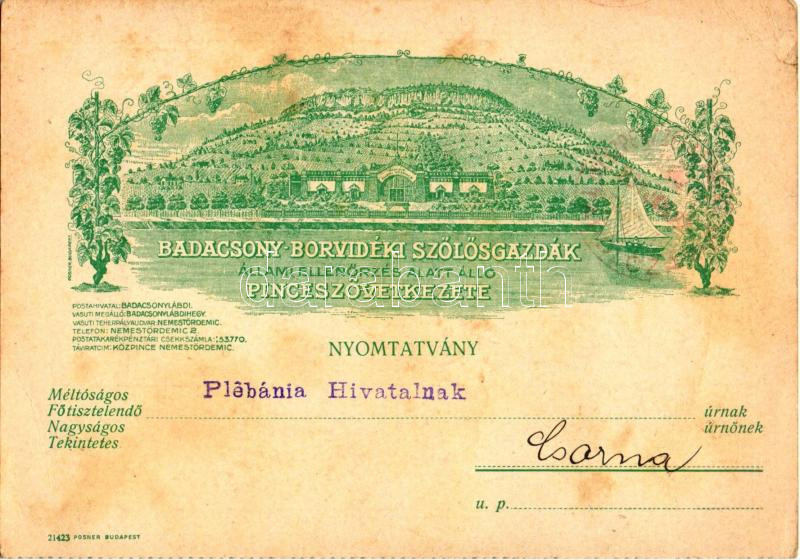 Badacsony, a Badacsony borvidéki szőlősgazdák pinceszövetkezetének reklámlapja; hátoldalon borárjegyzék (apró szakadás, nem képeslap hátoldalú)
