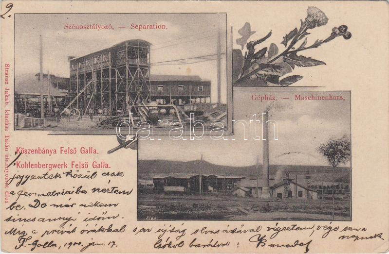 Felsőgalla, Kőszénbánya, Szénosztályozó, gépház, floral, kiadja Straus...