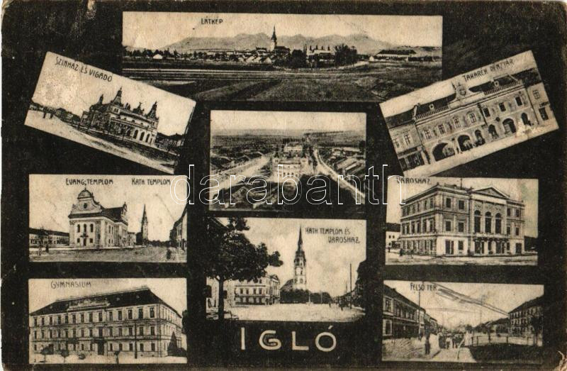 Igló, Színház és vigadó, Városháza, Gimnázium, Felső tér, Takarék pénztár / theatre, town hall, grammar school, square, bank (EK)