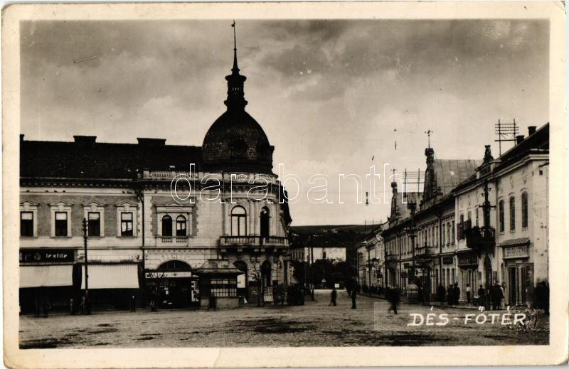 Dés, Fő tér, Román könyvtár, textil üzlet, gyógyszertár / main square, textile shop, pharmacy