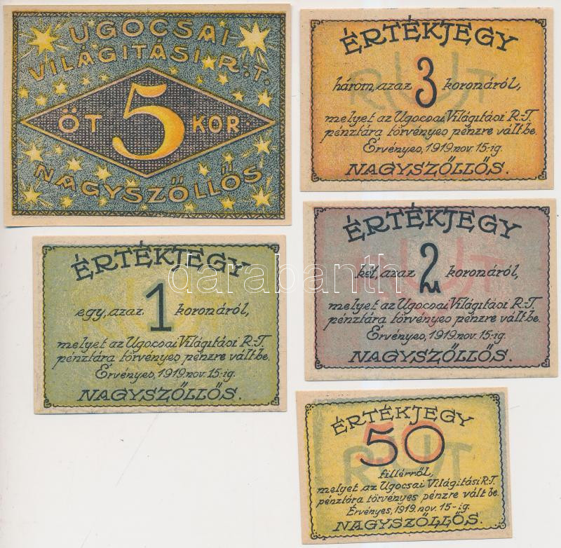https://www.darabanth.com/en/236-Online-auction/236.0/Numismatics/Emergency-Coins-and-Notes~200006/Nagyszollos-1919-50f-plus-1K-plus-2K-plus-3K-plus-5K-Ugocsai-Vilagitasi-Rt-ertekjegy-boritekban-TI~II1086249