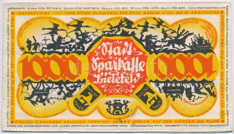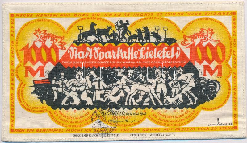 Németország / Weimari Köztársaság / Bielefeld / 1922. 1000M sárga, vászon, bélyegzéssel T:I