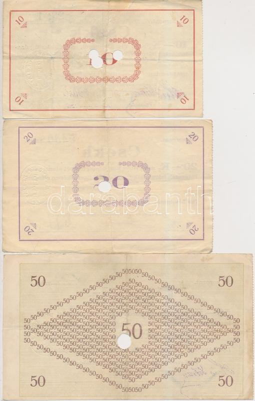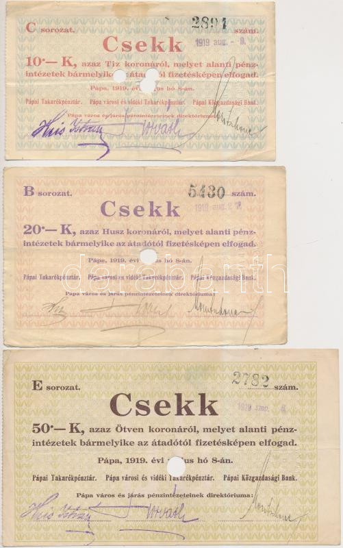 Pápa 1919. május 8. "Pápai csekk" 10K + 20K + 50K mind lyukasztással é...