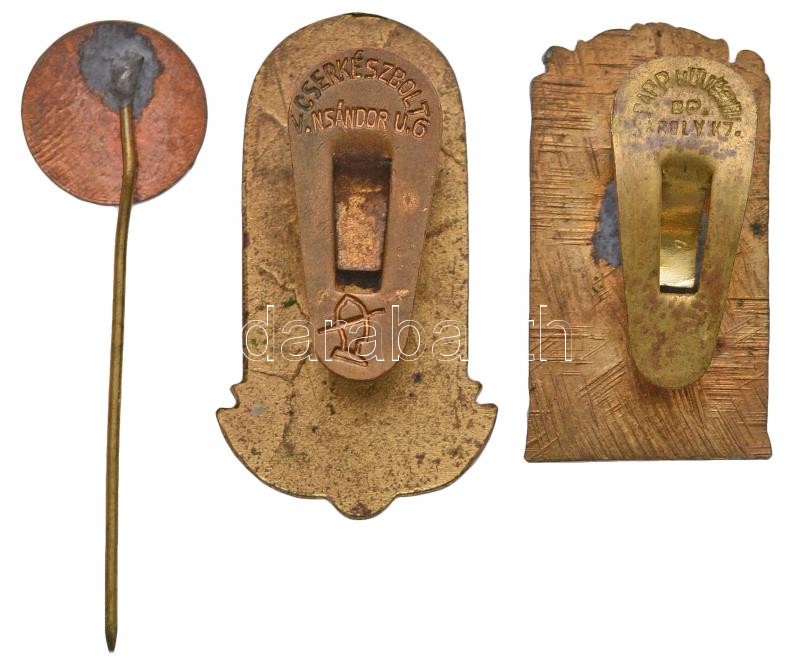Description: 3db klf jelvény és kitűző, közte 1934. "Tornász Világbajnokság Budapest" aranyozott Br gomblyukjelvény. Szign.: Cserkészbolt V. N Sándor u.6. + DN "Budapest Általános Munkás Daloskör" zománcozott fém gomblyukjelvény. Szign.: Papp Művészetek Bp. Károly K7. T:2