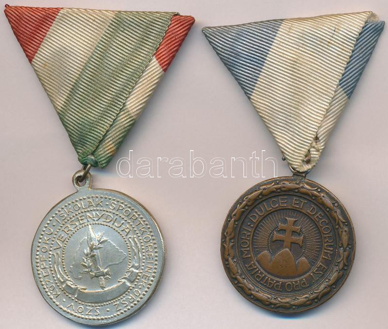 Description: ~1930. "Középfokú Iskolák Sportköreinek Országos Szövetsége - Versenydíja / Dulce et decorum est pro patria mori (Édes és dicső dolog a hazáért meghalni)" ezüstözött Br és Br díjérem mellszalagon (30mm) T:2,2-