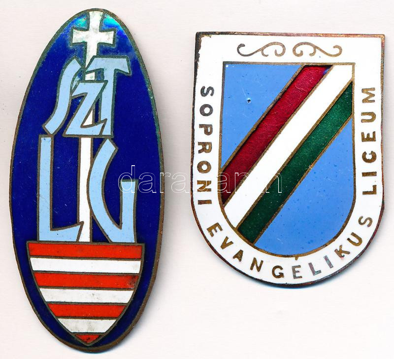 ~1930. "Szent László Gimnázium" zománcozott Br jelvény (58x27mm) + "Soproni Evangélikus Liceum" zománcozott Br jelvény (43x33mm) T:2,2-
