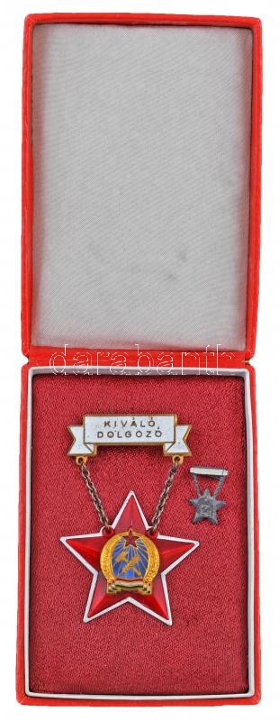 ~1950. "Kiváló Dolgozó" Rákosi-címeres zománcozott fém kitüntetés miniatűrrel, Rákosi-címeres tokban T:2
