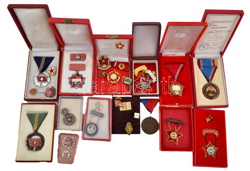 Kis doboznyi vegyes kitüntetés, jelvény és kitűző tétel, a szocialista időszakból, több tokban, közte 1970. "Díszszemle" zománcozott fém jelvény, DN "5 éves munkáért - Gépállomás" zománcozott fém kitűző, 1972. "A Haza Fegyveres Szolgálatában" zománcozott fém kitüntetés mellszalagon, szalagsávval együtt tokban, igazolvánnyal T:vegyes