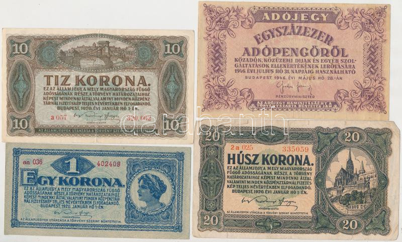 14db-os vegyes magyar bankjegy tétel, közte sor-és sorszám nélküli adópengők, 1920. 1K (2x) közeli sorszámmal T:vegyes