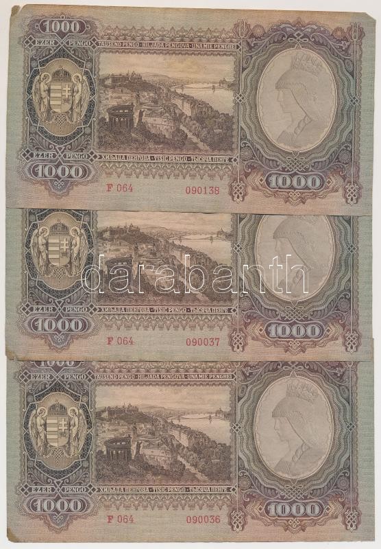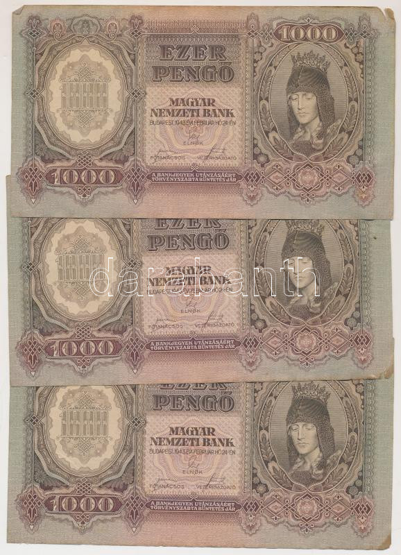 https://www.darabanth.com/en/236-Online-auction/236.0/Numismatics/Hungarian-Banknotes~200007/1943-1000P-3x-sorszamkovetok-TII-hajtatlanok-folt-kis-szakadas~II1034639