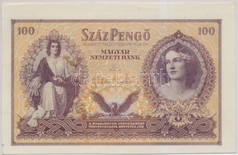 https://www.darabanth.com/en/236-Online-auction/236.0/Numismatics/Hungarian-Banknotes~200007/1943-100P-Szalasi-kiadas-sor-es-sorozatszam-nelkul-TI-II-hajtatlan-foltos-3Cbr3E~II1083188