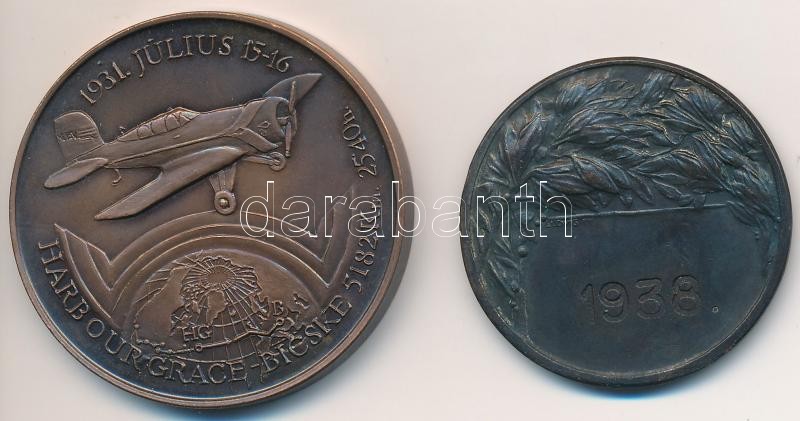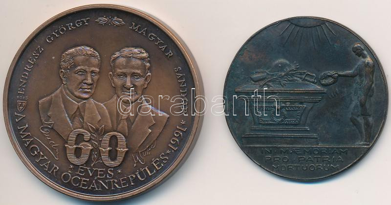 Description: 1938. "In maemoriam pro patria mortuorum / 1938" Br emlékérem hátoldalán "LUDVIG" gyártói jelzéssel (35mm) + Bozó Gyula (1913-2004) 1991. "60 éves a magyar óceánrepülés Endresz György - Magyar Sándor / Harbour Grace - Bicske" Br emlékérem (42,5mm) T:2,2-