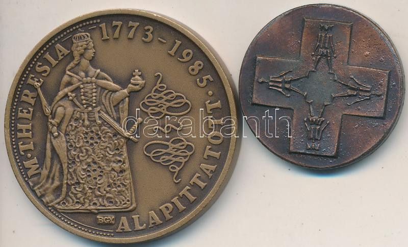 Description: 1971. "50 éves a Magyar Ifjúsági Vöröskereszt 1921-1971" Br emlékérem (30mm) + Bognár György (1944-) 1985. "Bizományi Áruház Vállalat 40 év 1945-1985 / M. Theresia 1773-1985. Alapíttatott" Br emlékérem sérült tokban (42,5mm) T:1-,2