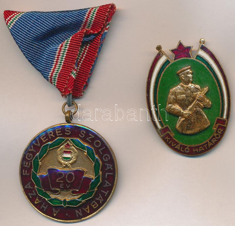 Description: ~1960-1970. "Kiváló Határőr" zománcozott jelvény dísztokban + "A Haza Fegyveres Szolgálatában, 20 év" zománcozott kitüntetés mellszalagon, nem saját tokban T:2