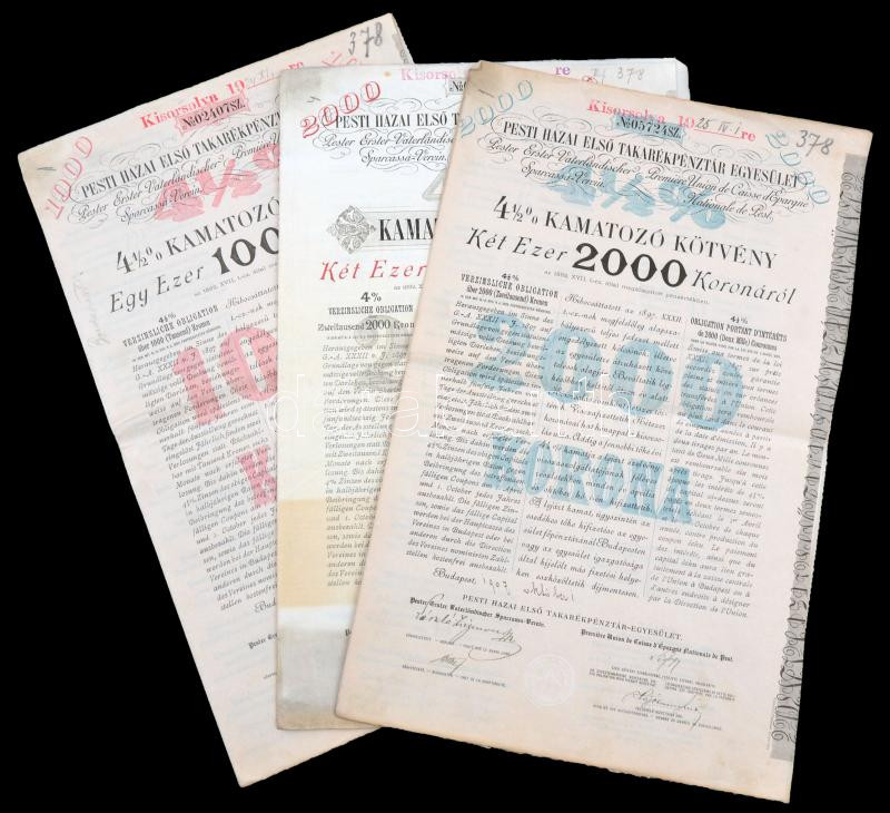 Description: Budapest 1899-1907. "Pesti Hazai Első Takarékpénztár-Egyesület" 4 1/2%-kal és 4%-kal kamatozó kötvény 1000K-ról és 2000K-ról szelvényekkel, bélyegzésekkel (3x) T:II,III