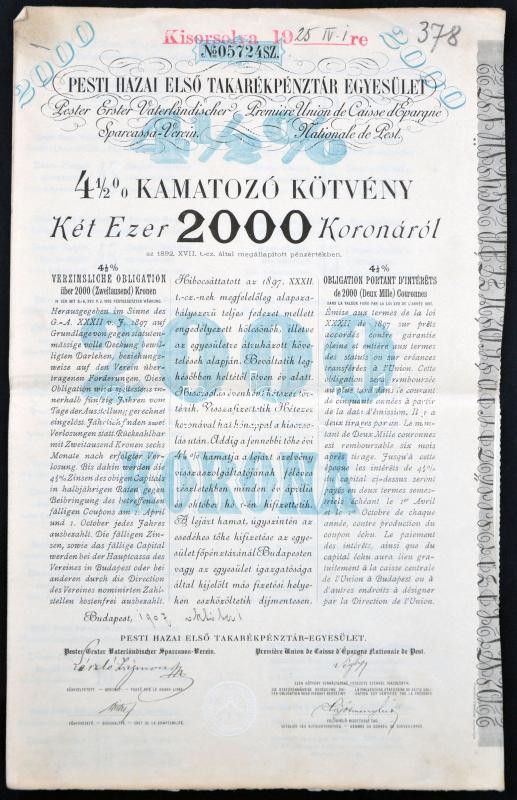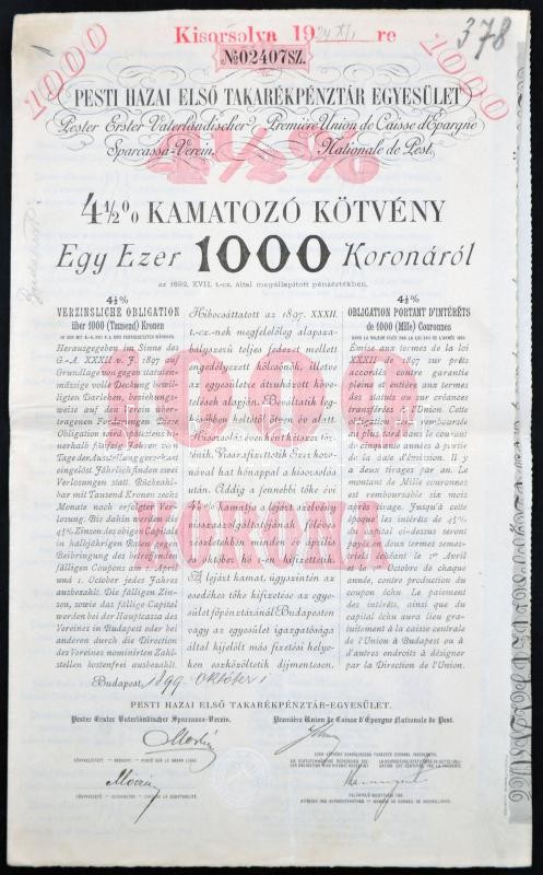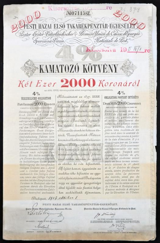 Budapest 1899-1907. "Pesti Hazai Első Takarékpénztár-Egyesület" 4 1/2%... https://www.darabanth.com/en/236-Online-auction/236.0/Numismatics/Shares-and-Tickets~200005/Budapest-1899-1907-Pesti-Hazai-Elso-Takarekpenztar-Egyesulet-4-1225-kal-es-425-kal-kamatozo~II1082272