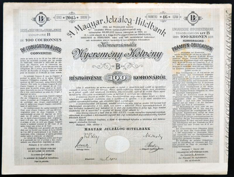 Budapest 1906. "Magyar Jelzálog-Hitelbank Nyeremény-Kötvény" 100K-ról, 3 nyelven, szárazpecséttel T:II-