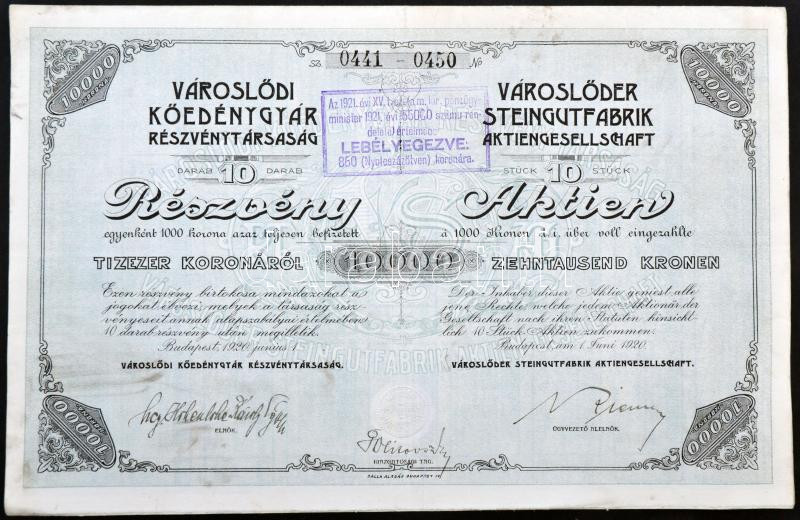 https://www.darabanth.com/en/236-Online-auction/236.0/Numismatics/Shares-and-Tickets~200005/Budapest-1920-Varoslodi-Koedenygyar-Reszvenytarsasag-10db-reszvenye-egyenkent-1000K-r~II1086472