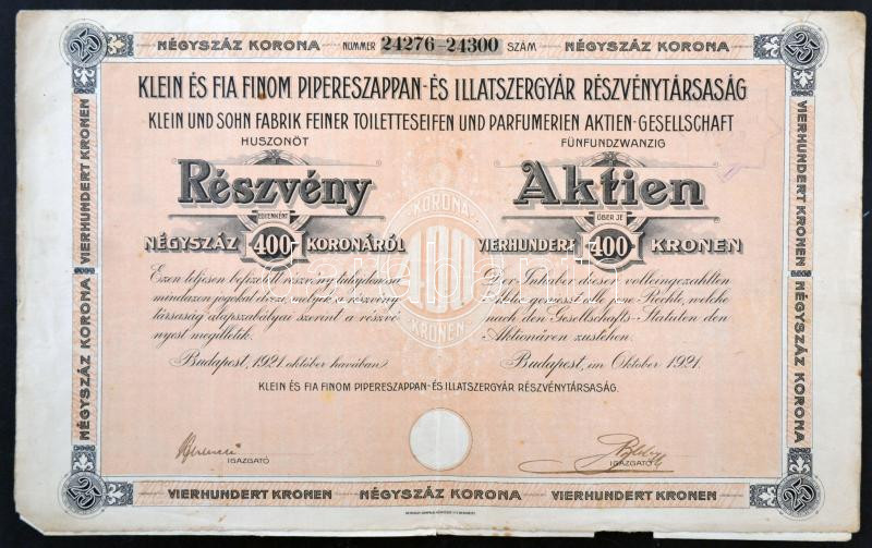 https://www.darabanth.com/en/236-Online-auction/236.0/Numismatics/Shares-and-Tickets~200005/Budapest-1921-Klein-es-Fia-Finom-Pipereszappan-es-Illatszergyar-Reszvenytarsasag-25-res~II1087135